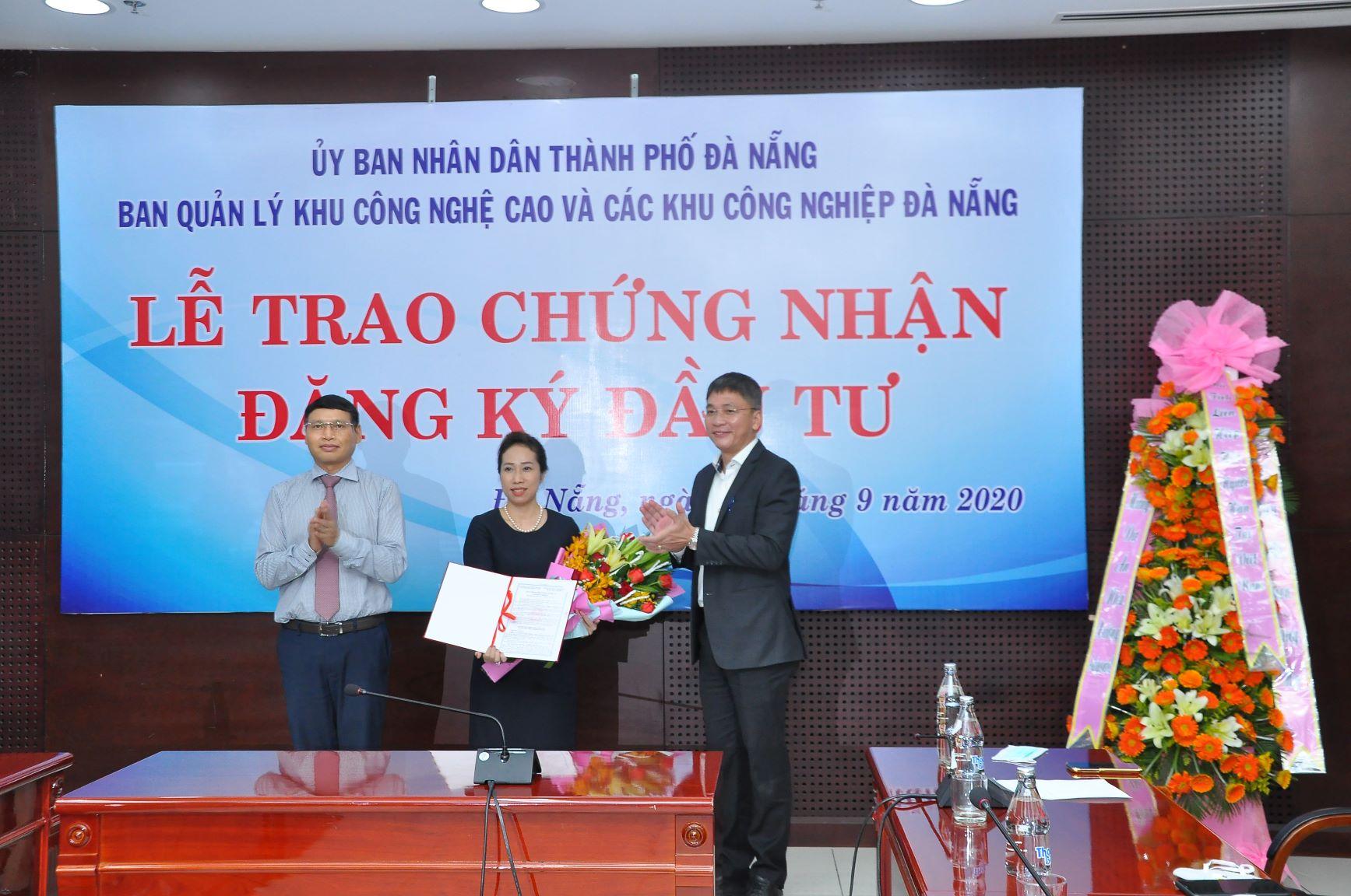 Mr. Pham Truong Son (right), Head of the Management Board of Hi-Tech Parks and Industrial Parks of Da Nang City, awarded the investment registration certificate to SAIGONTEL
