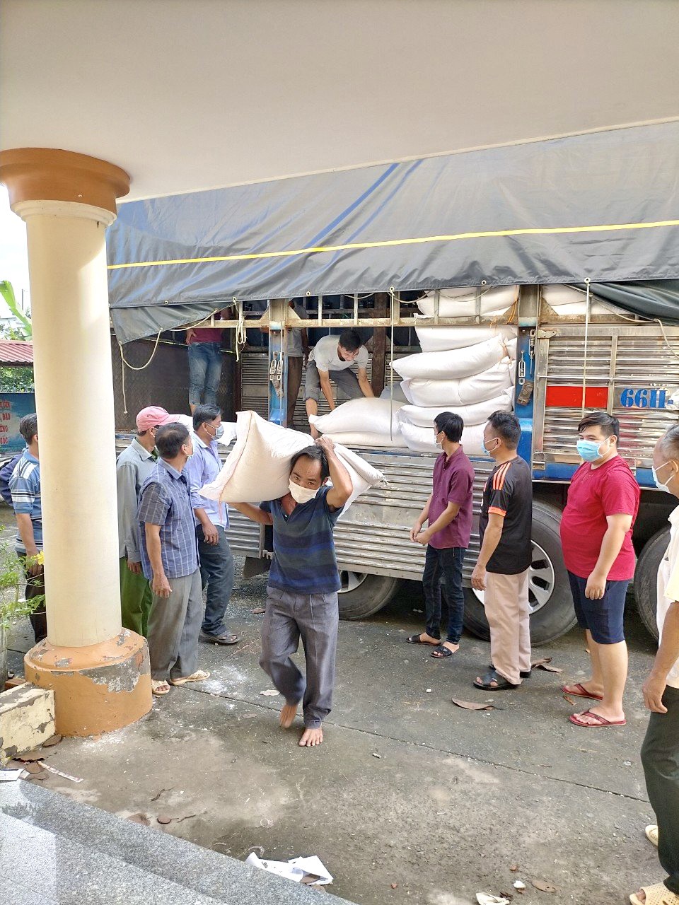 Trao tặng gạo của Saigontel cho bà con tại điểm phát gạo tại UBND thị trấn Vĩnh An, huyện Vĩnh Cửu